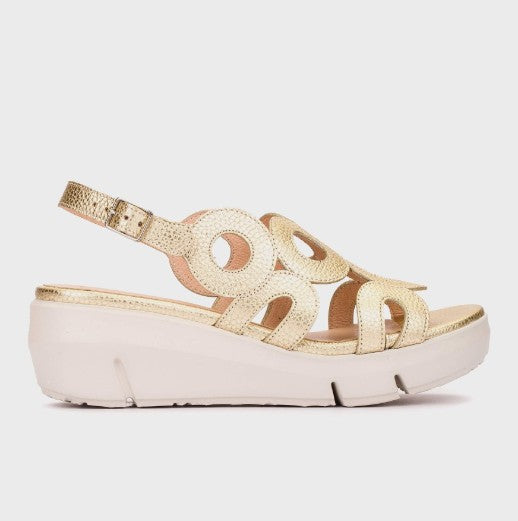 FLYNN 82 wedge sandals in gold metallic leather. This model has a versatile and sophisticated design, with geometric openwork in the shape of a circle. They have a buckle fastening on the outside of the ankle to ensure a perfect fit. Its sole. The sole, created with WondersFly™ technology, guarantees exceptional lightness and extraordinary comfort. In addition, the MemoryGel sockliner adapts perfectly to the foot, providing comfort with every step. Get ready for the feeling -